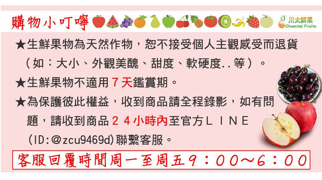 水果為天然農產品,無法像加工食品控管每顆水果內部都完好或相同味道,川太鮮果也無法一顆顆切開再寄給消費者,僅能從外觀為您篩選, 不能接受者請勿下單。